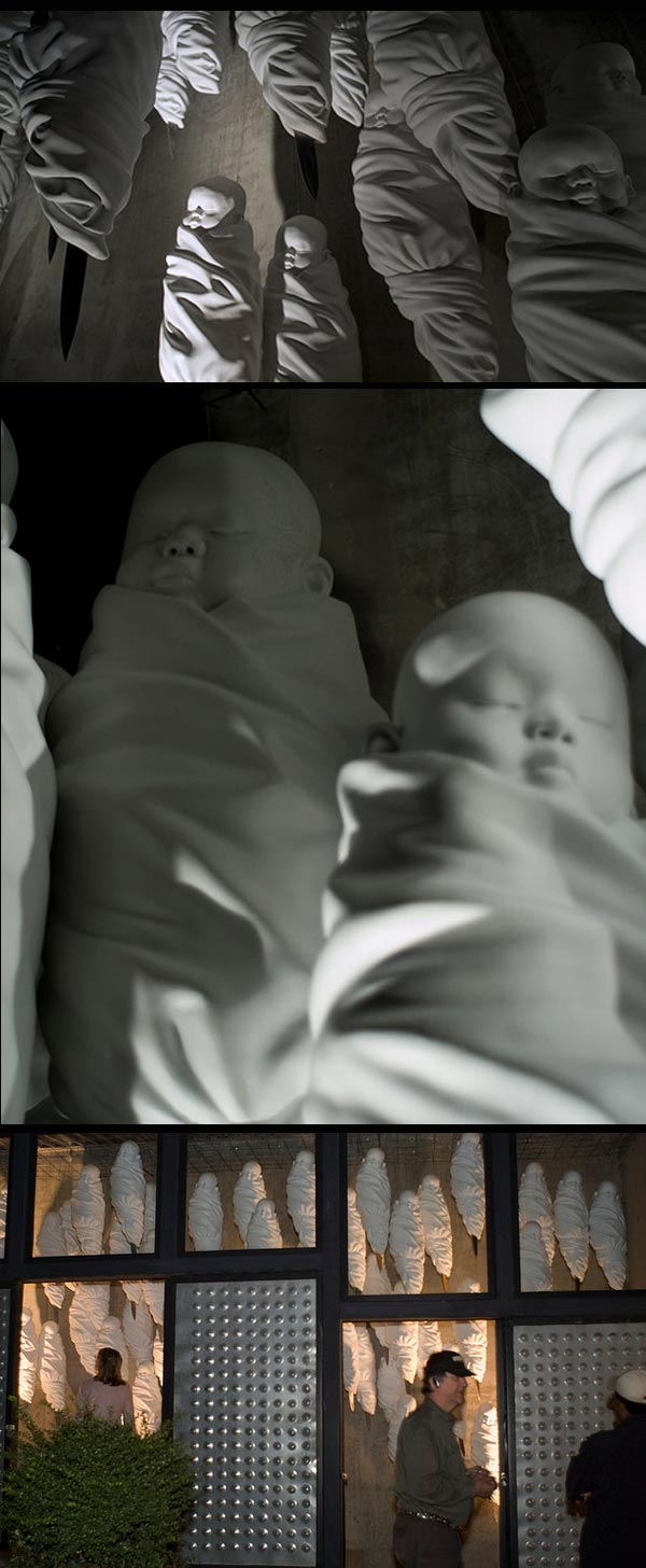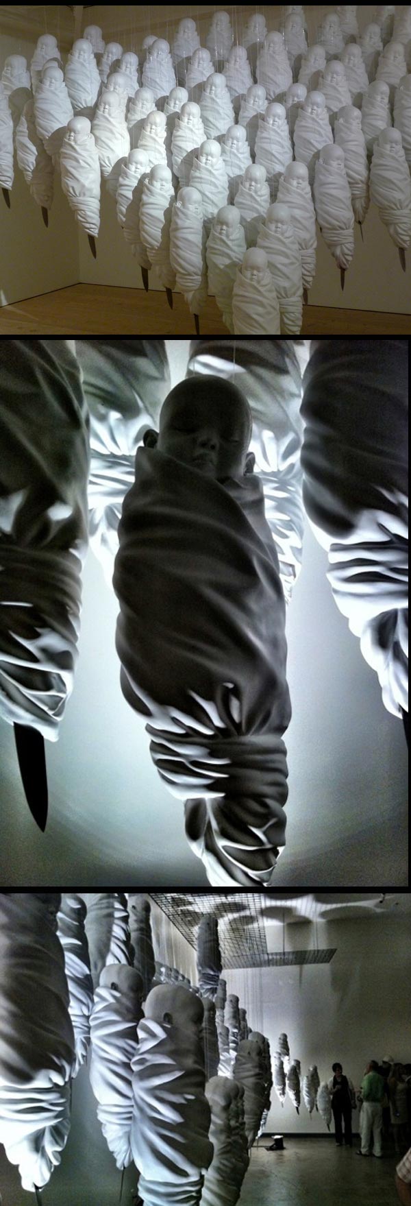 Di bawah ialah instalasi arca yang diberi tajuk Visitasi. 100 patung bayi yang diperbuat daripada resin dan digantung dan ada diantaranya dicacah.